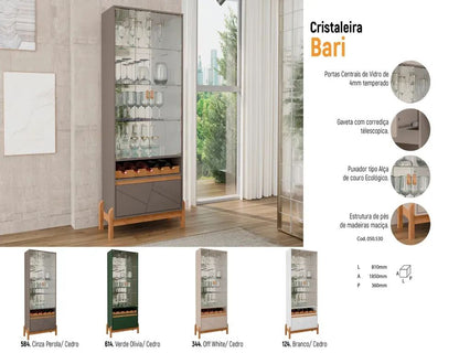 Com a mistura de elementos minimalista e retrô, o buffet Bari é um móvel cheio de personalidade e indicado para deixar sua sala de jantar ou estar, ainda mais charmosa. Possui quatro portas, sendo duas em vidro temperado de 4mm e as outras duas em MDF de 15mm ambas com prateleiras internas. Estrutura de pés de madeira maciça. É ideal para armazenar aparelhos de jantar, travessas e copos. Seu tampo também pode ser utilizado como apoio para objetos decorativos, bebidas ou até mesmo como bancada para acomodar utensílios para servir drinques e petiscos.