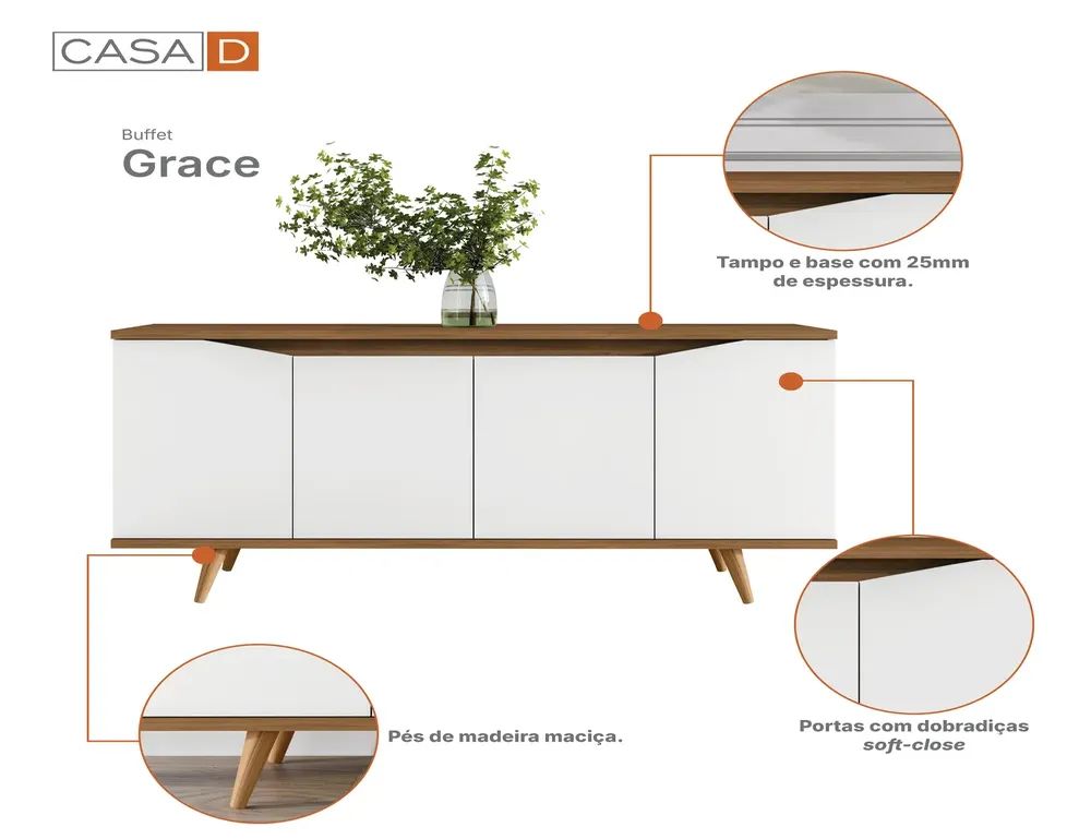 O Buffet Grace irá agregar muito mais charme e requinte à sua sala! Com design moderno, ele possui 160cm e amplo espaço interno que irá acomodar perfeitamente qualquer tipo de objeto. Base e tampo em chapa de 25mm. Portas em chapa de 15mm com sistema de dobradiças metálicas de 35mm e sistema Soft Close. As portas também contam com o sistema de frentes passantes, tal sistema apresenta visual clean e assim permitindo um ar moderno, minimalista e sofisticado. Pés de madeira maciça com sapatas reguláveis e protetoras que proporcionam ao móvel maior resistência e qualidade sem riscar o piso no qual for instalado. Sua pintura conta com acabamento Print Wood, patenteado e exclusivo Casa D, garante ao produto maior qualidade e durabilidade como nenhuma no mercado possui. Produto em MDP/MDF