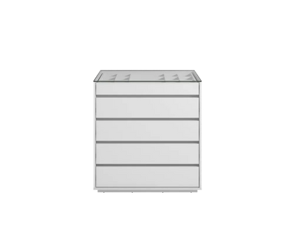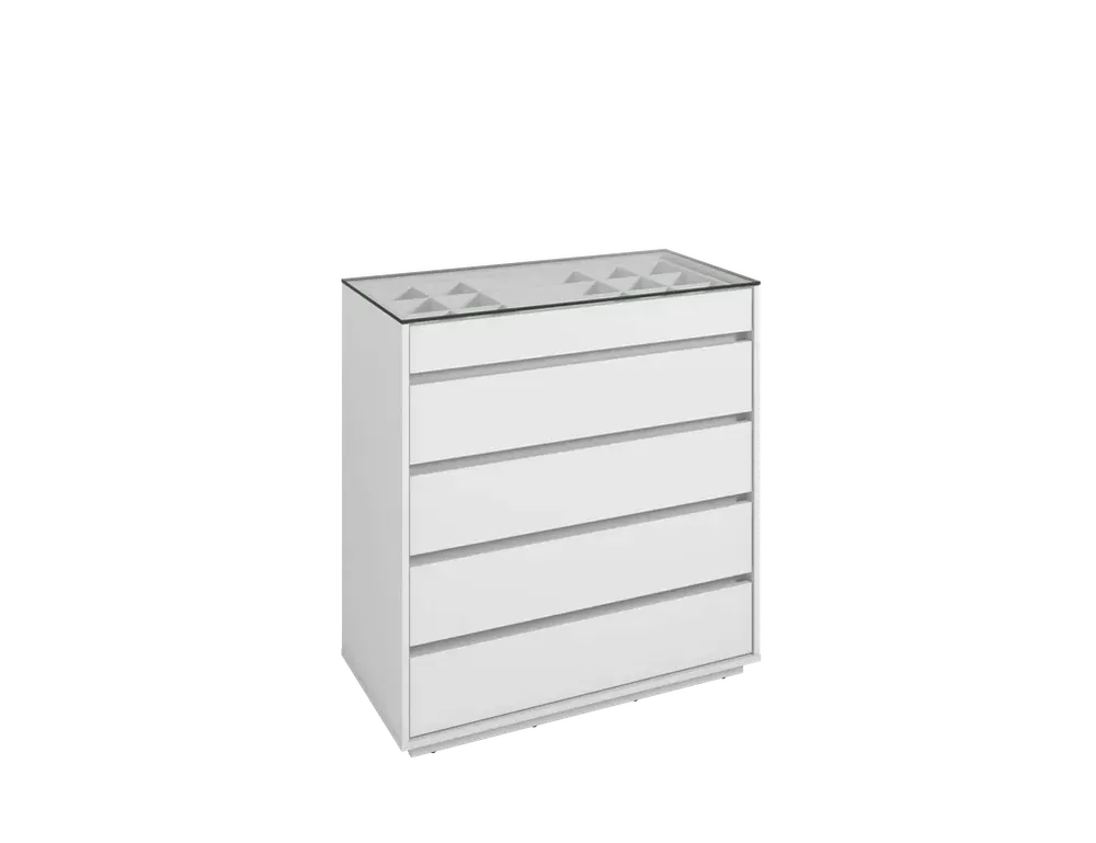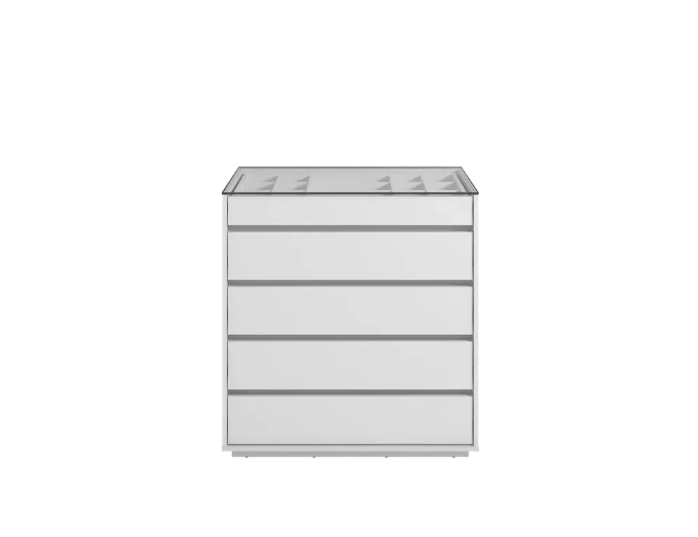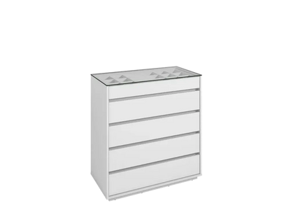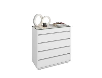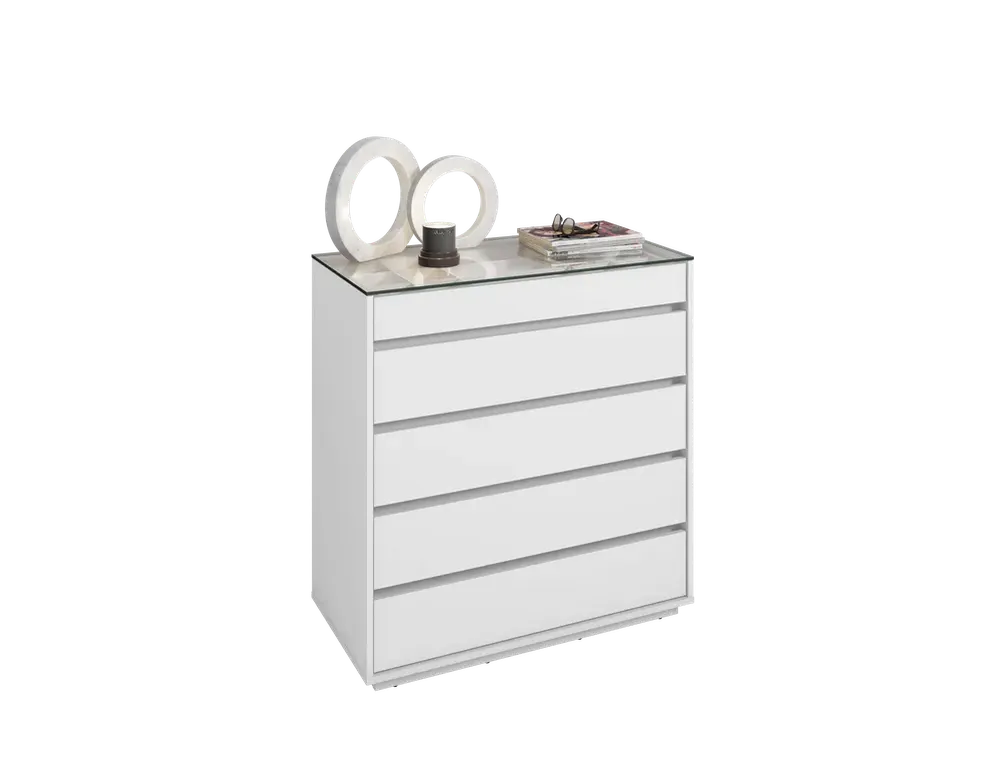 O Cômoda Belize é ideal para o seu quarto! Ele possui 5 gavetas sendo que a superior possui um organizador interno para joias, relógios, etc, feito em MDF. As gavetas possuem corrediças telescópicas. Tampo de vidro, base e laterais feitos em MDP de 25mm, e possui 5 travessas transversais em MDP de 15mm que garante maior estabilidade e resistência à estrutura.
