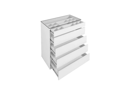Estrutura elaborada em MDP de 25mm e 15mm e Tampo de Vidro. Gavetas com corrediças telescópicas.