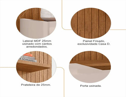 Elaborado em MDP de 25m e 15m. Prateleira de 25m, laterais de MDF 25mm. Painel frisado, exclusivo Casa D.