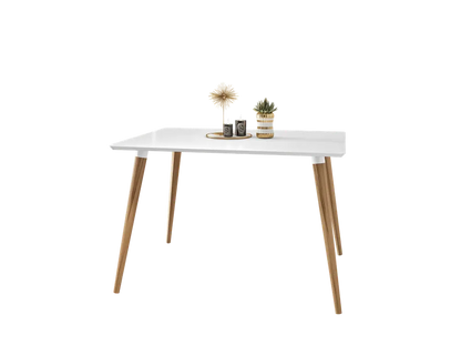 Tampo elaborado em MDF de 25mm usinado com cantos arredondados, pés feitos em madeira maciça (Pinus) com sapata de silicone para protetor o piso no qual for instalada a mesa. Suporte para fixação dos pés em aço, especialmente desenvolvido para garantir maior estabilidade da mesa. Pintura com acabamento Print Wood, patenteado e exclusivo Casa D, atóxico e anti mofo. Bordas com acabamento Soft PU.