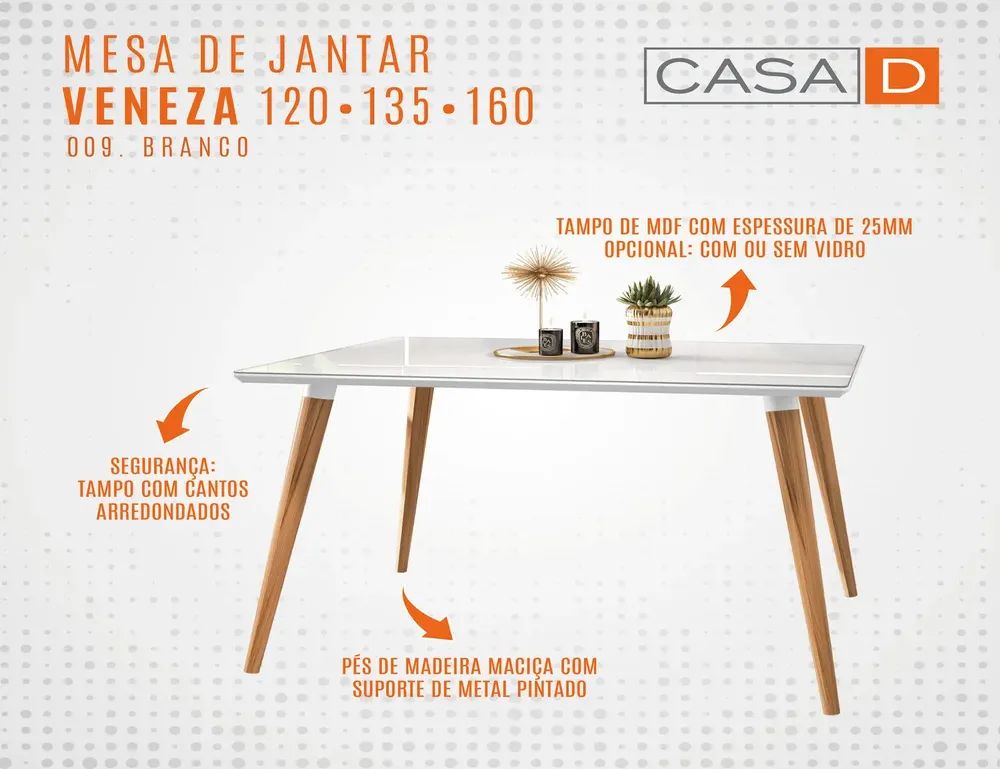 A Mesa Veneza é o que falta em sua Sala de Jantar! Com designer moderno ela irá agregar muito charme e requinte ao ambiente. Tampo em MDF de 25mm usinado com cantos e borda arredondados. Suporte para fixação dos pés em aço, especialmente desenvolvido para garantir maior estabilidade da mesa. Pés são feitos em madeira maciça o que proporciona ainda mais resistência e qualidade à mesa. Cada pé possui uma sapata protetora de silicone para garantir que a mesa não risque o piso no qual for instalada. Suporta 4 lugares! Sua pintura com acabamento Print Wood, patenteado e exclusivo Casa D garante ao produto maior qualidade e durabilidade como nenhuma no mercado possui.