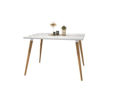 Tampo elaborado em MDF de 25mm usinado com cantos arredondados, pés feitos em madeira maciça (Pinus) com sapata de silicone para protetor o piso no qual for instalada a mesa. Suporte para fixação dos pés em aço, especialmente desenvolvido para garantir maior estabilidade da mesa. Pintura com acabamento Print Wood, patenteado e exclusivo Casa D, atóxico e anti mofo. Bordas com acabamento Soft PU.