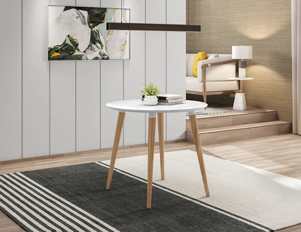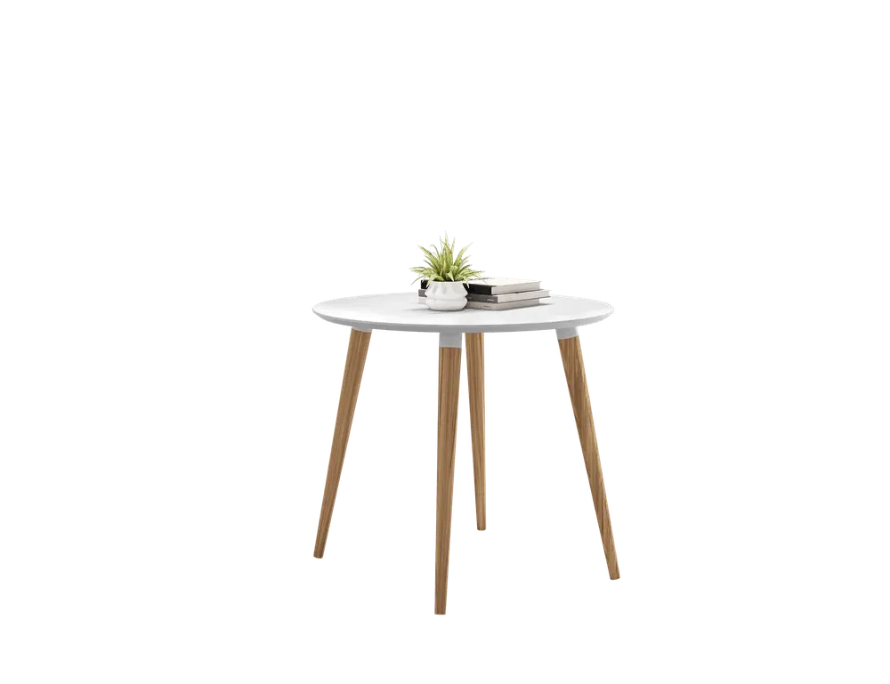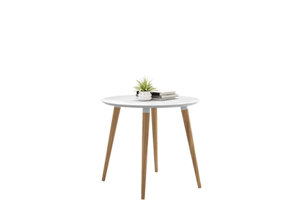 Mesa redonda com pés de madeira maciça, e suporte de aço para fixação dos pés.